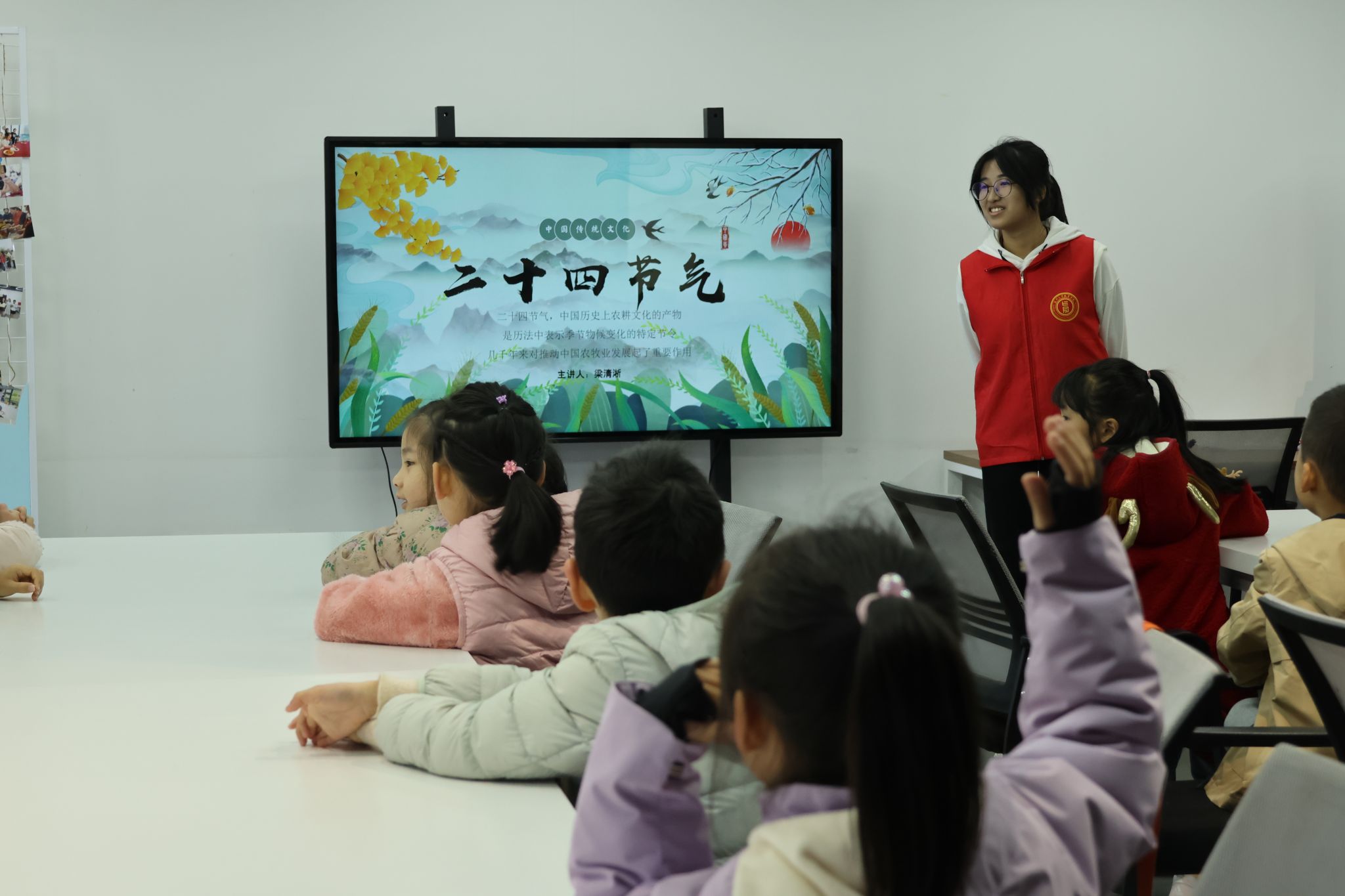本次活动的课程主讲是来自24小教的梁清淅同学,她以小老师的身份带领小朋友一同学习深入了解二十四节气。活动课程主要分为“绘本小故事”“二十四节气歌”“节气回家小游戏”与“雪花书签小手工”等。梁清淅同学以大雪这一节气作为课程导入,通过询问12月6日的节气促使同学们进入课堂状态举手抢答。小朋友们也是十分积极地发言,清脆的童音在教室里回荡,每一个回答都大声响亮,为整个课堂增添了一抹绚丽多彩的活力。