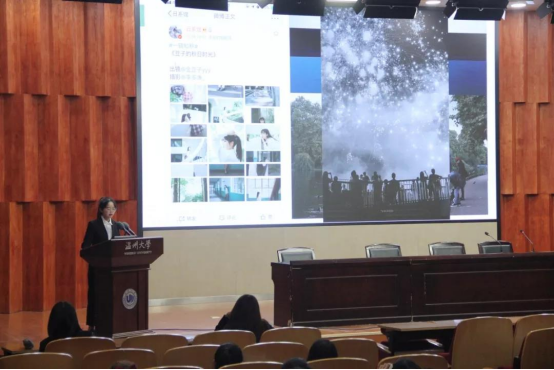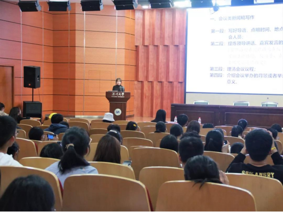 讲座伊始,团委学生会副主席钱文静讲解了有关通讯稿写作的相关基础知识。她从通讯的定义、特点、分类入手,结合具体的通讯写法与常见通讯稿内容范例,形象地讲述了如何写出一篇“靠谱”的通讯。另外,钱文静着重提出了通讯稿的写作几点注意事项,不能带有主观情感、详略得当、逻辑明了,并提供范例文段让团学成员们实战练习修改。同时,钱文静也表达了对团学成员们的希冀,“凡有所学,皆有所成。希望在团学点滴经历,都能成为你大学时光里最难忘的注脚”。
