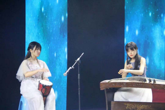 陈祯祯、徐优可同学的器乐合奏《西域随想》余音绕梁,鼓与筝的合鸣,好似跌入西域夕阳。