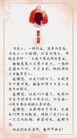 其实除了以上几位老师之外,其他的老师都给我留下了较为深刻的印象,如课堂紧凑有趣,了解众多饮食健康知识的陈旭微老师;拥有优美嗓音,和蔼优雅的陈芳老师;博古通今,为我们娓娓道来中国古代文学发展历程的施春晖老师……甚至还有那些未曾谋面或未曾上过课的教院的老师们,教院以及教院学子们得以越来越出色离不开每一位老师的辛勤付出,在此我也想要对所有教院的老师们说一声真挚的“谢谢”与“教师节快乐”!