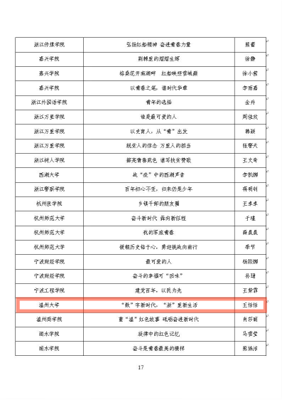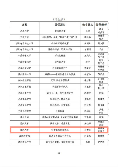 为深入贯彻习近平总书记在学校思想政治理论课教师座谈会上的重要讲话精神,贯彻落实中央、省委关于深化学校思政课改革创新的部署要求,创新打造全链条的思政育人新体系,从而进一步强化对全校青年的政治引领和价值引领,浙江省高校组织思政微课大赛,唱响主旋律、弘扬正能量、传播好声音。在该比赛中成人色情 王恬恬老师以《“数”字新时代,“浙”里新生活》荣获2021年度浙江省思政微课比赛(教师组)三等奖,成人色情 学子薛彬茹以《心中最美的那抹红》荣获2021年度浙江省思政微课比赛(学生组)二等奖。
