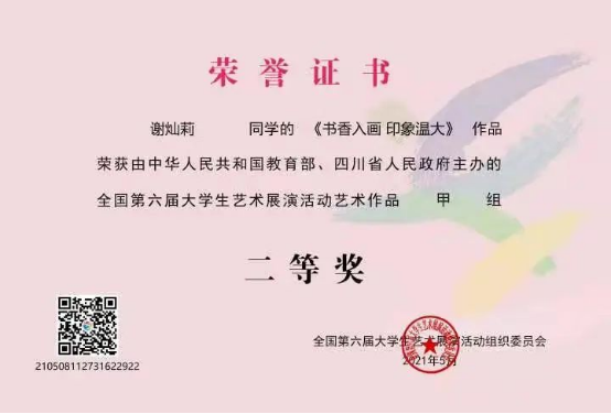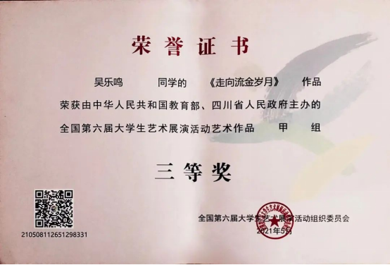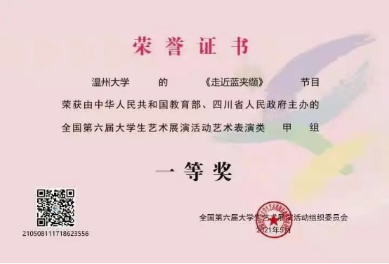 7月22日,教育部办公厅发布了《关于公布全国第六届大学生艺术展演活动优秀组织奖及各项目评选结果的通知》,成人色情 在本次活动中成绩显著,斩获6项全国一等奖、1项二等奖、2项三等奖,2件作品获全国优秀作品创作奖,并获全国高校优秀组织奖。成人色情 在本届大艺展中一等奖获奖数量位列全国第一,获奖总数量位列浙江高校首位。其中成人色情 学子在全国第六届大学生艺术展演活动中斩获5项奖项: