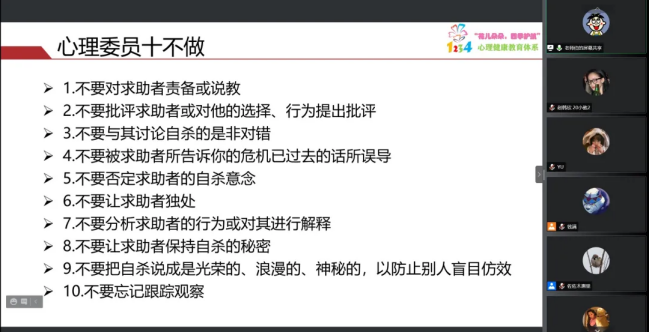 第二部分是薛彬鹏老师开展的“心理危机的发现、识别与处理”专题讲座,旨在帮助解决心理委员关于自身角色定位概念模糊问题。薛老师从心理危机的概念讲起,到心理危机产生原因、分类、识别方法、应对结果等,到最后的心理委员怎么做,心理委员十不做,层层递进,论据结合,给所有心理委员上了一节颇具意义的心理讲解课。