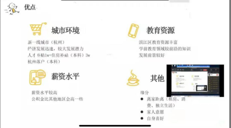 首先,周胜男向学子们分享了提前批经验。她围绕选择的理由、流程与条件、提前批准备、经验与技巧等四个方面进行讲解。在关于选择工作的理由这方面,她为学子列出了几个考虑方向,如城市环境,教育资源,薪资水平等,并综合分析了优缺点,让学子更加全面理性的了解工作应如何做出最好的选择。此外,周胜男还细心为学子们介绍了招考流程,针对发布公示、自主投送、准备面试这三方面,提醒学子提前批应未雨绸缪,尽早做好相关准备。