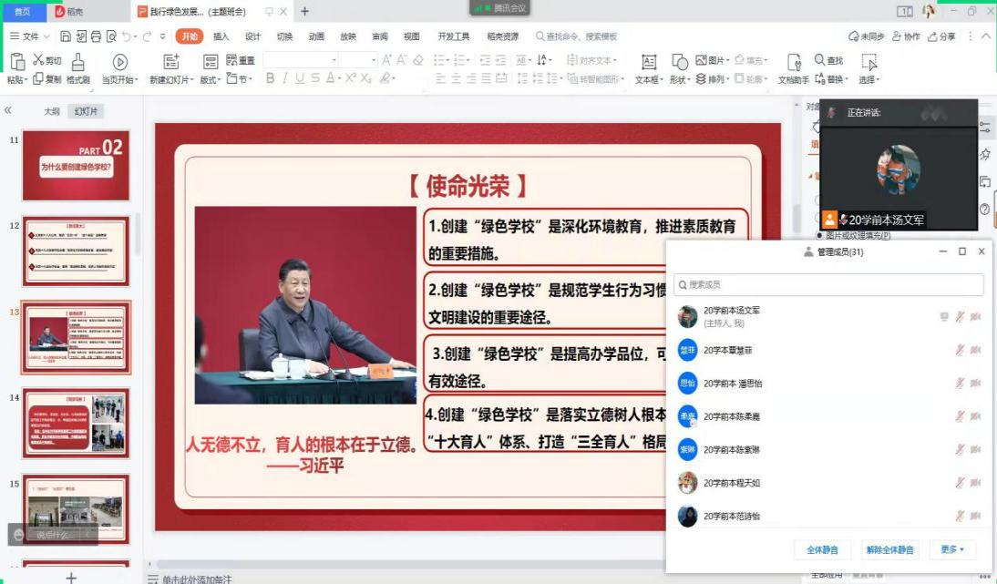 为进一步引导全校师生学习习近平生态文明思想、践行绿色发展理念,帮助师生养成绿色的生活方式和行为规范。我校以“绿色校园”为主题,在各班展开一系列的教育活动。20小教1,20小教2,20小教4班,20教技,20学前本的同学通过开展“绿色校园”主题班会了解了什么是绿色学校,为什么要创建绿色学校以及如何创建绿色学校。20小教3,20应心通过线上会议让同学们明白了绿色学校的创建不是一朝一夕的事情,只有所有同学一起努力,才能创建成人色情 绿色学校。21级的班级也逐步开展了班级会议了解了绿色学校创建的政策背景、创建缘由以及如何创建绿色学校。本次“绿色校园”主题班会,坚持以习近平生态文明思想和党的十九大精神为指引,积极响应国家创建绿色学校的号召,牢固树立社会主义生态文明观,争取班级同学学习思想,采取务实的行动举措。在精神文明领域自律自觉,物质层面利用科技高效监控,双管齐下同筑生态文明之基,共走绿色发展之路。只有每个人付出真正的行动,才能改善我们的校园生态环境。爱护环境,创建绿色学校,从点点滴滴做起,从每一个人做起。