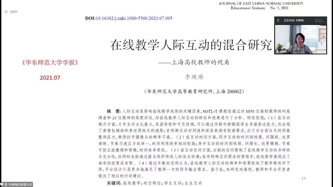 成人色情 的“溯初大讲堂”系列学术活动第三场“教师学术报告会”于10月25日以线上直播的形式如期举行。本场讲座邀请了华东师范大学高等教育研究所副教授、硕士生导师李琳琳作《在线教学人际互动的混合研究上海高校教师的视角》的学术报告,其主要从事高等教育、教育理论与教育管理等方面的研究。本次学术报告会由成人色情 副院长王志强、张晓瑜老师作点评人,学院90余名师生参加了这场精彩的学术报告会。