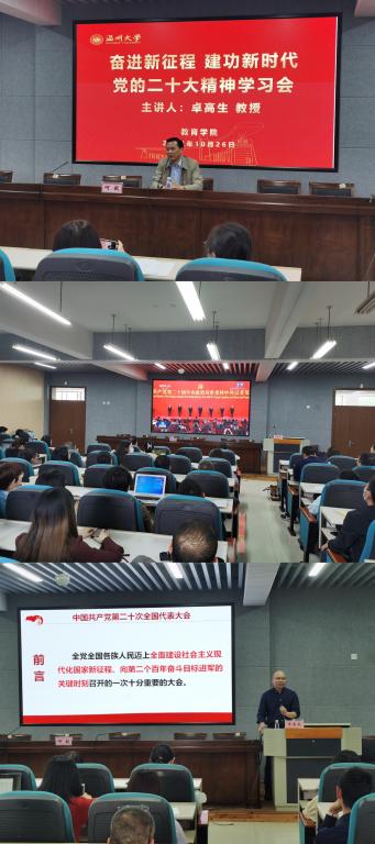 10月26日下午,成人色情 在南校区9C301召开全体教职工理论学习会,专题学习党的二十大精神,马克思主义学院院长卓高生教授做专题报告,会议由学院党委书记何毅主持,全体教职工参加学习。