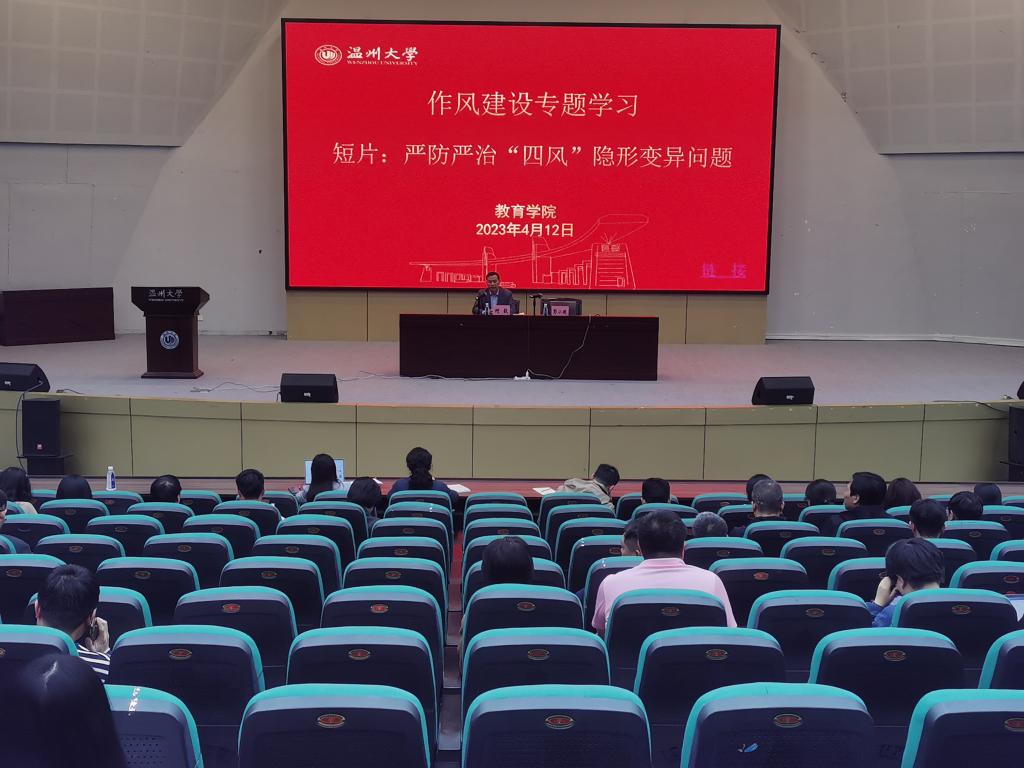 会议开展作风建设专题学习。全体教职工观看警示片《严防严治“四风”隐形变异问题》。会议指出,视频中通报借培训之名组织公款旅游典型问题,意在警示广大党员干部要从中深刻汲取教训,牢记“三个务必”,践行初心使命,严守纪法红线。作为高校教师,更要严守党纪国法,不得借举办或参加培训、会议之名进行考察旅游类活动,在日常接待中要严守标准,杜绝铺张浪费。