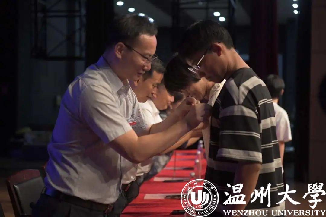 领导老师们为新生代表佩戴校徽。熠熠闪光的校徽象征着学院对新生们的美好祝愿与殷切希望,更是传承与嘱托。
