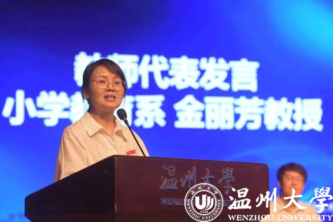 院教师代表、小学教育系教授金丽芳致辞。金教授对所有新生的到来表示热烈欢迎。她强调,选择了教育,意味着更大的责任与担当,家长、学校、社会将寄予更高期望。金教授对大家提出了三点建议:一是要树立目标,明确方向。有梦想但不止梦想,要求有坚持不懈的努力;二是要求知若渴,掌握知识。知识是世界的边界,知识到哪里,世界就到哪里;三是要脚踏实地,向阳而生。勤勉且奋斗,守纪且自律,拼搏且超越。最后,金教授表示,教院全体教师都将为教院学子保驾护航,祝愿同学们开启新篇章,精彩且收获。