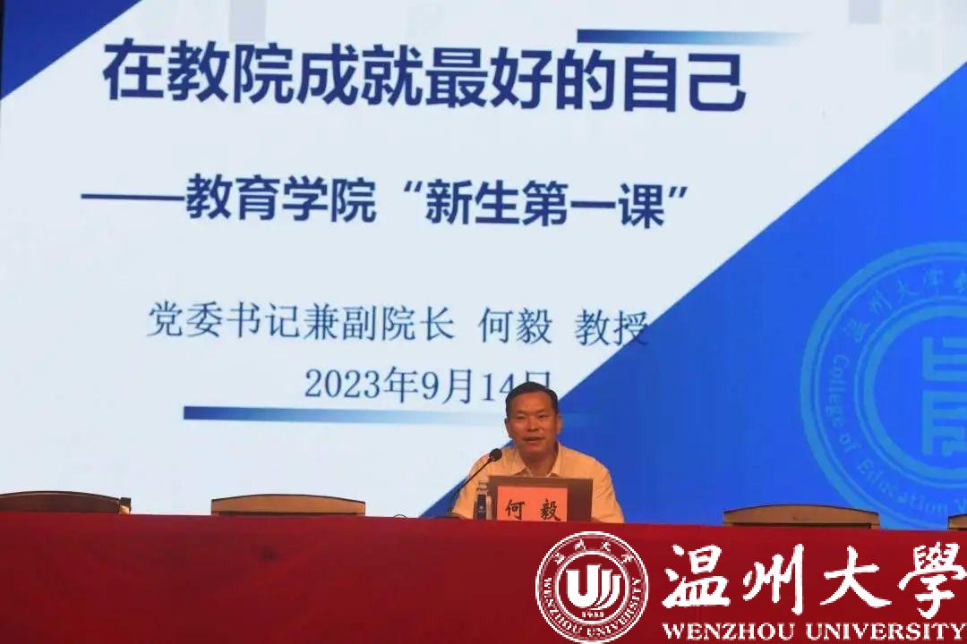 院党委书记兼副院长何毅教授为全体新生带来了主题为《在教院成就最好的自己》的“新生”第一课,并从认识教院、成就自己两个方面进行介绍。何毅书记从教院的“久、大、全、强、特、优”六个特色展开,介绍了温大教院的办学传承、师资队伍、学科建设、科学研究、专业建设、人才培养、特色文化、服务地方、国际合作、党建思政等十大方面,体现出教院的历史悠久、规模庞大、办学层次全、办学实力强、师范特色突出、办学质量优秀。在成就自己的部分,何毅书记提出苏格拉底的三个哲学问题,他希望同学们可以立志高远,努力把自己培养成为党和人民满意的“四有”好老师,为培养德智体美劳全面发展的社会主义建设者和接班人贡献力量。