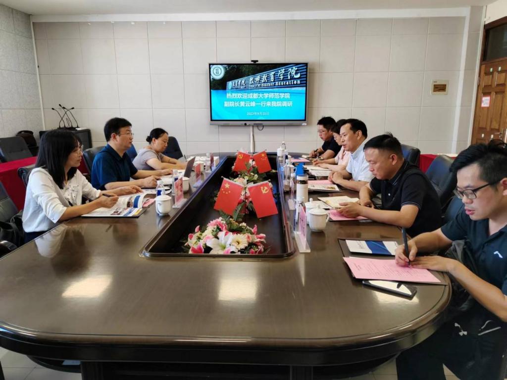 2023年9月25日上午,成都大学师范学院黄云峰副院长一行三人来成人色情 调研交流。学院党委书记何毅、副院长叶新东及相关老师参加座谈交流会。