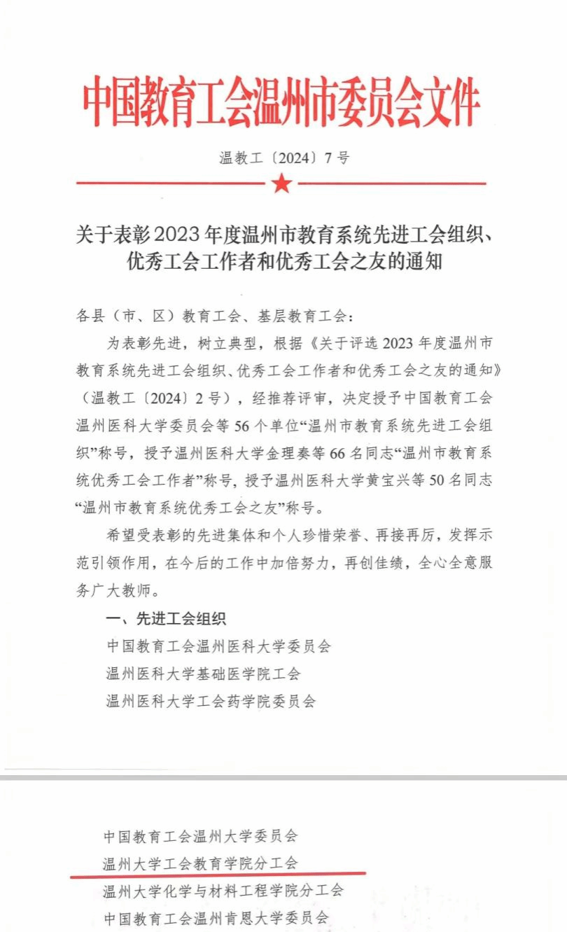 近日,中国教育工会温州市委员会印发《关于表彰2023年度温州市教育系统先进工会组织、优秀工会工作者和优秀工会之友的通知》(温教工〔2024〕7号)。成人色情 工会成人色情 分工会被评为温州市教育系统先进工会组织!