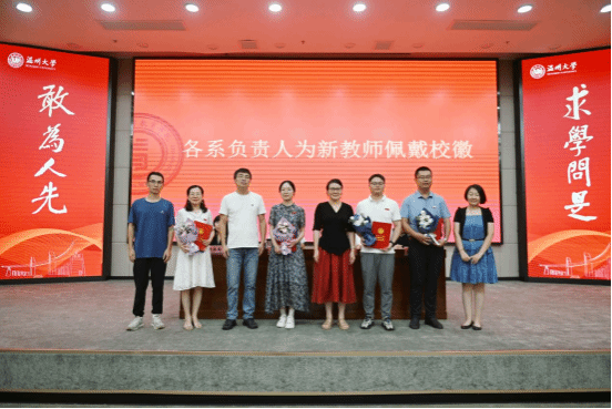 学院举行新教师入职仪式。李长吉院长、张敏书记为王鹏等四位新入职教师颁发入职纪念证书、教师师德承诺书、师德师风建设制度摘要等,并合影留念。各系(中心)负责人为新教师佩戴校徽,送上鲜花,表达对新入职老师的热烈欢迎和殷切期望。