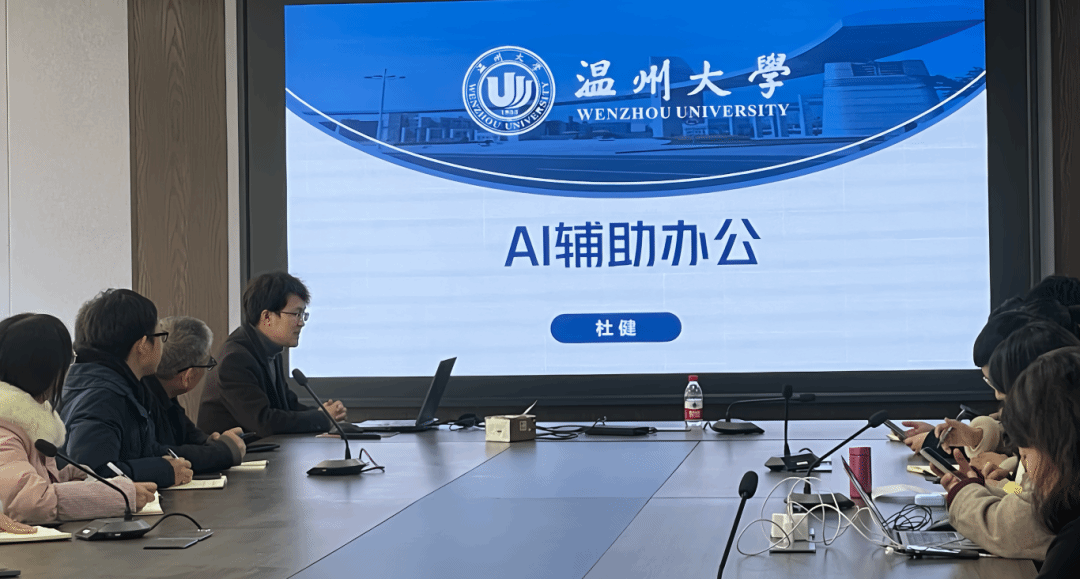 培训开始后,杜健老师以温大校训“求学问是 敢为人先”开场,强调了在数字化浪潮中,教育工作者应积极学习新技术,以科技之力推动教育创新。随后,杜老师详细阐述了AI技术在平日工作中的四大应用:图像录音转文本、公文写作、图像处理和教学资料收集。