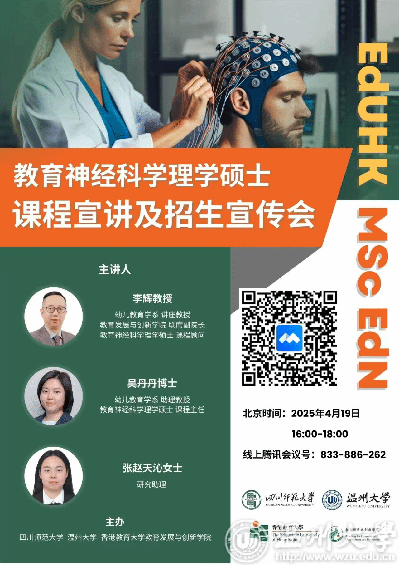 宣讲会上,香港教育大学李辉教授、吴丹丹博士为我校学子全面解读教育神经科学这一前沿交叉学科。课程以教育学、神经科学与认知心理学深度融合为特色,涵盖脑成像技术、学习机制及教育干预等核心领域,致力培养兼具科研能力与实践经验的复合型人才。两位老师重点介绍了香港教育大学的学科优势(2024年QS教育学排名亚洲第四、全球第十二)、香港唯一开设该硕士项目的学术地位,以及顶尖实验室资源与国际化学术平台的支持。