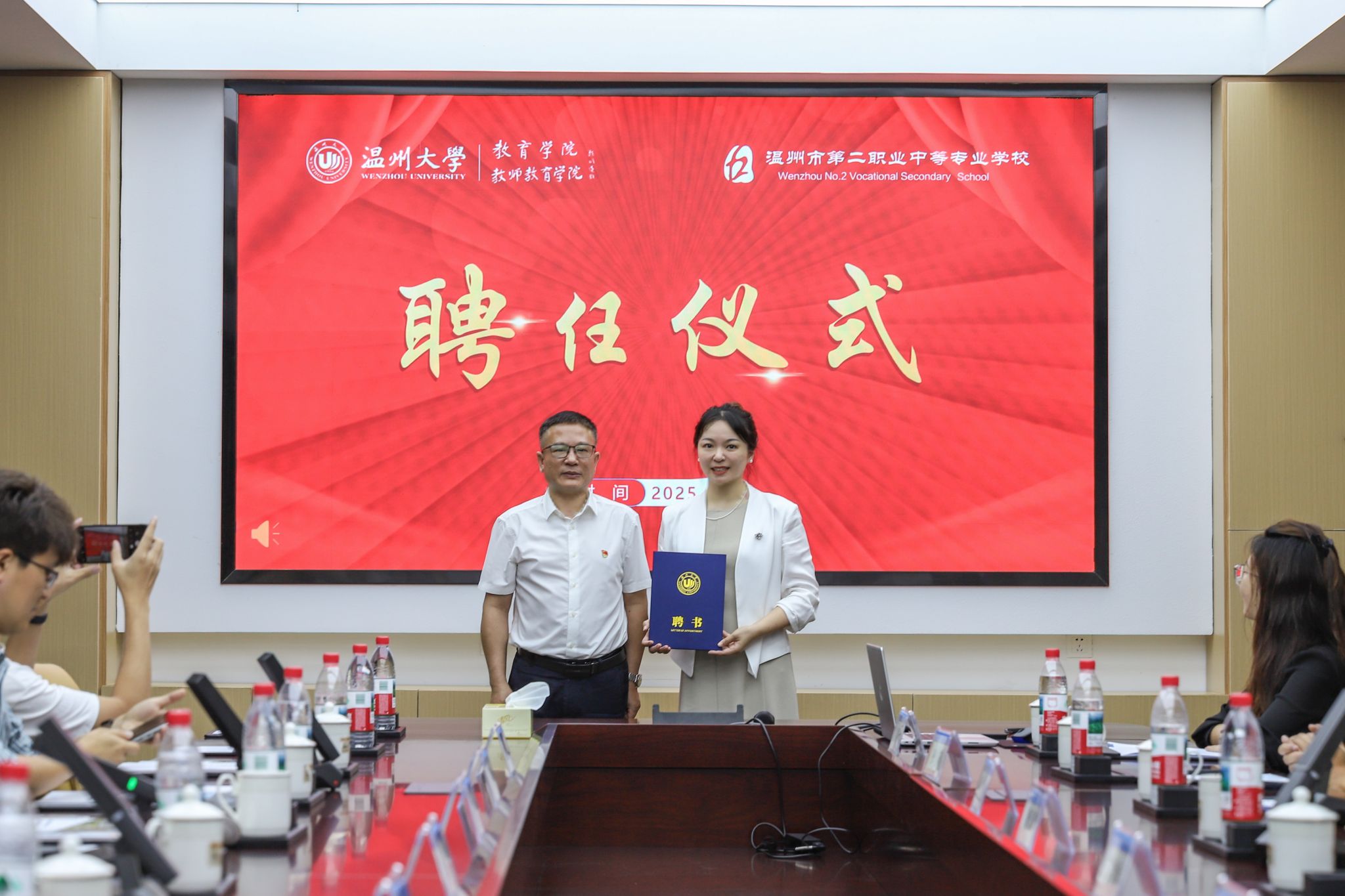 会议还举行教育专硕校外实践指导教师聘任仪式,张敏向温州二职校长潘乐慧博士颁发“成人色情 教育硕士专业(心理健康教育)校外实践导师”聘书。
