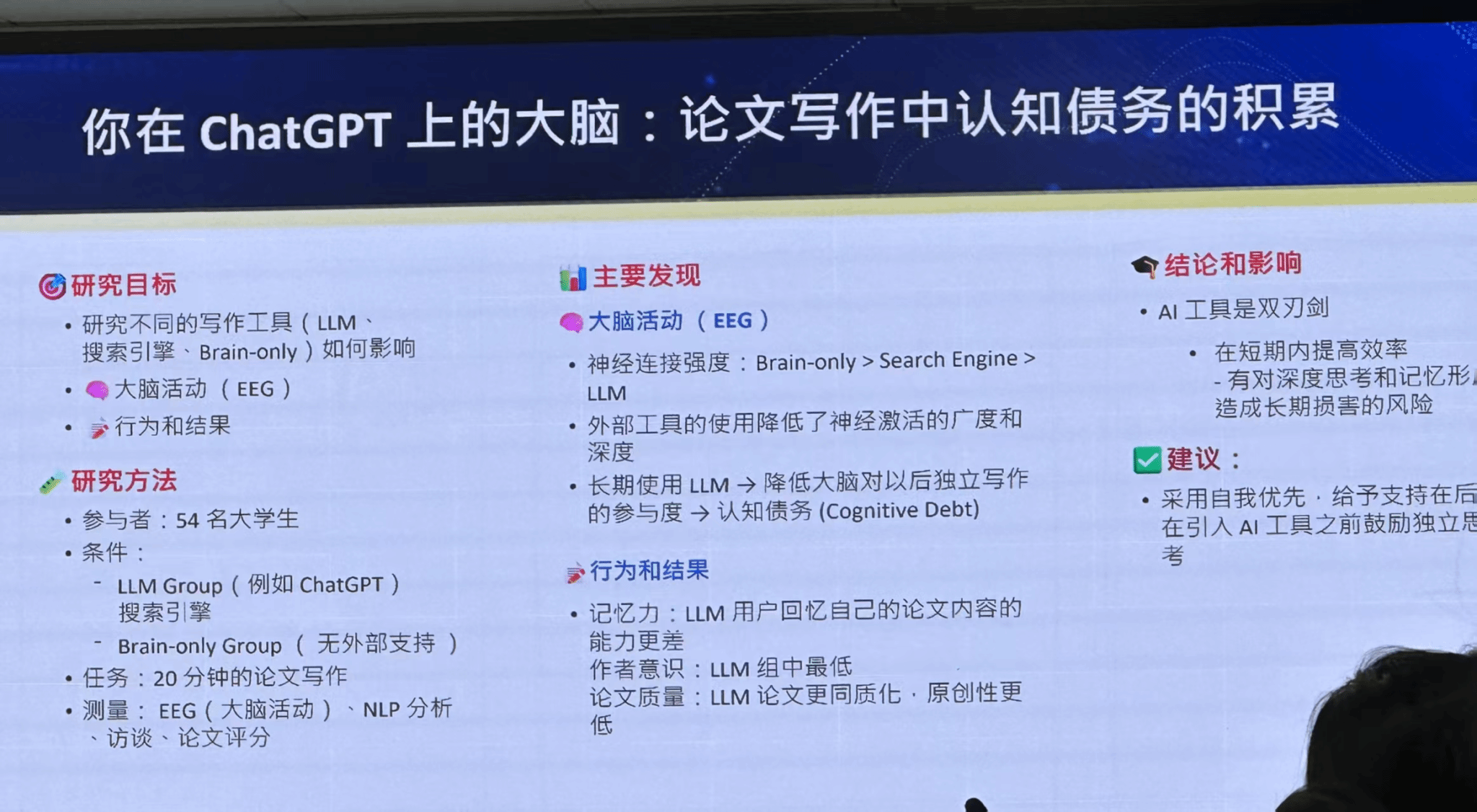 张教授首先介绍了美国麻省理工学院(MIT)团队2025年6月发表的一项研究,该研究探讨了AI工具对学生写作和大脑活动的影响。张教授指出,这项研究揭示了AI的“双刃剑”特性:短期内能提高学习效率,但持续使用将可能对深度思考和记忆形成长期损害。因此,他建议采用“自我优先 + AI 辅助”的模式,培养独立思考能力。