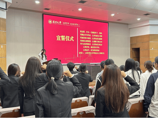 18时30分,仪式在学生主持人陆同学铿锵有力的开场中正式开始。全体师生起立,齐声高唱国歌,嘹亮的歌声回荡在报告厅内,以庄严的仪式感唤醒师生对“为党育人、为国育才”初心的深刻共鸣。