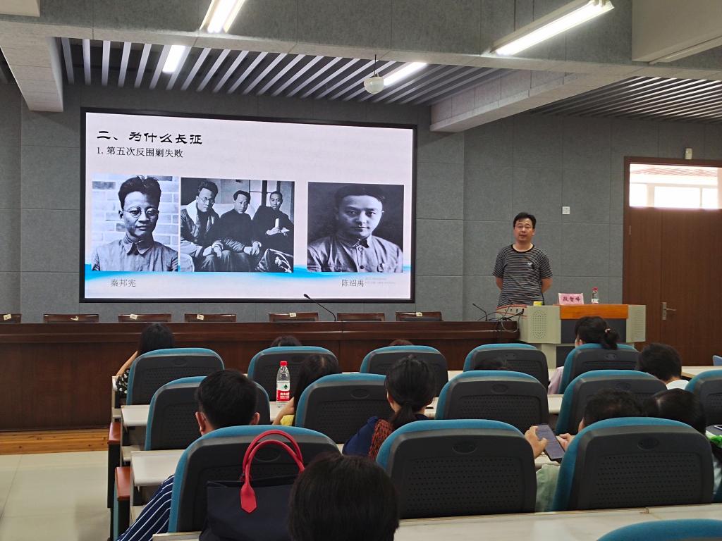 全院教职工大会后,学院召开教职工理论学习会,开展党史学习教育专题学习。马克思主义学院段智峰博士作题为《长征与长征精神》的报告。红军长征是20世纪最能影响世界前途的重要事件之一,段智峰博士从长征的概念,为何长征,长征的基本历程,长征精神及其启示等四个方面进行深入的阐述。翔实的史料、生动故事,学院教职工被理想信念坚定、奋不顾身的长征精神所感动,深深体会到革命成果和当下幸福生活来之不易,大家迸发了奋勇拼搏、开创更加美好生活的激情。