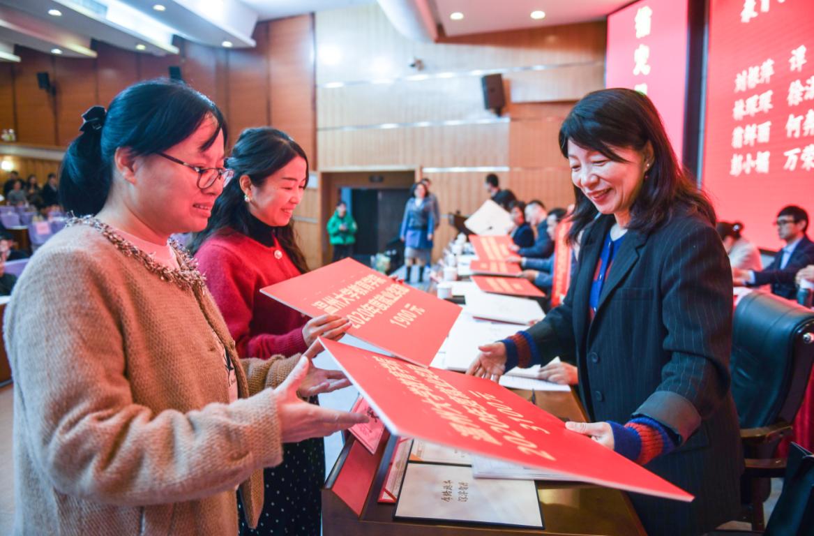 会议在雄壮的国歌声中开幕。在欢快喜庆的音乐中,学院领导为2020年度成人色情 院长特别奖获得者,成人色情 优秀共产党员、优秀教师、优秀教育工作者、优秀班主任、优秀辅导员、抗击疫情先进个人,成人色情 就业工作奖励获得者,校和院工会先进获得者,成人色情 优秀培训项目、优秀培训讲师,省优秀示范团支部、省高校优秀团支部,省市优秀辅导员等进行颁奖。