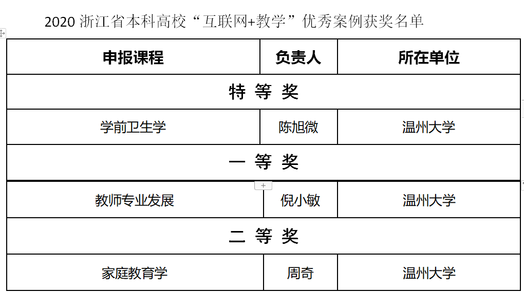 近日,浙江省高等教育学会公布了2020浙江省本科高校“互联网+教学”优秀案例获奖名单,成人色情 3门课程案例获奖,分别是陈旭微教授《学前卫生学》、倪小敏教授《教师专业发展》、周奇教授《家庭教育学》。