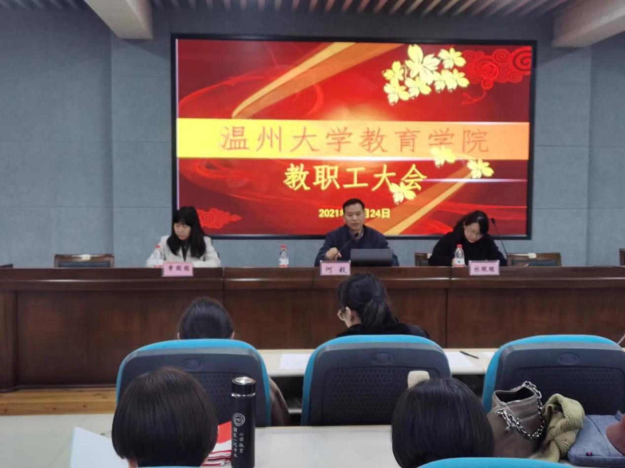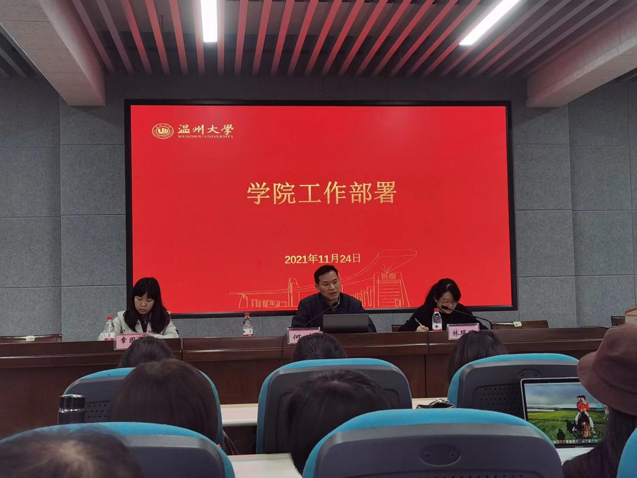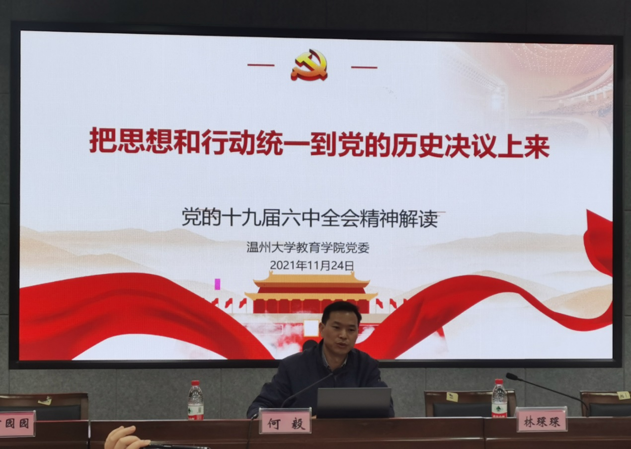 11月24日下午,成人色情 在南校区9C301召开全体教职工大会暨“十九届六中全会”精神理论学习会,学院全体教职工参加,何毅书记主持。