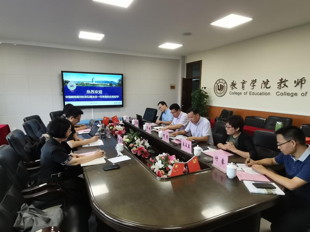 2021年10月14日上午,中国教育报刊社数据中心张以瑾主任一行3人来成人色情 交流指导。人文社科处处长胡瑜、学院党委书记何毅热情接待了来访专家,副院长王志强、宋占美及相关教师参加座谈研讨。