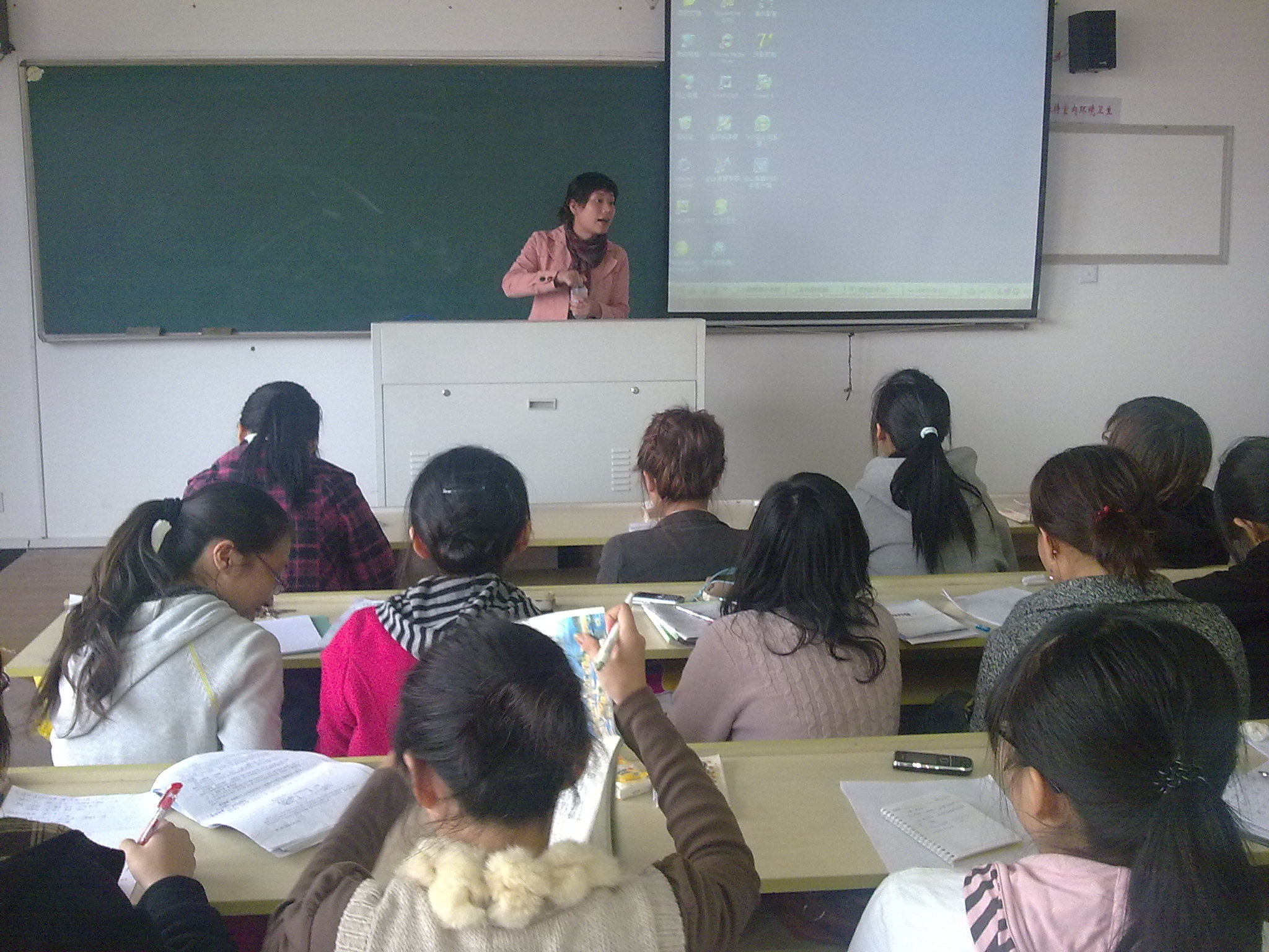 首先,缪老师从课文《小柳树和小枣树》的技能目标、认知目标和情感目标分析了她对该课文的理解,理出了课文的难点和重点:八个生字的教学和课文关键段的教学。同学们对《小柳树和小枣树》课文有了初步的教法印象之后,缪老师给大家放映了她获奖的上课录像。最后,她提出了教学反思,并和同学们互动,讲座气氛进入高潮。