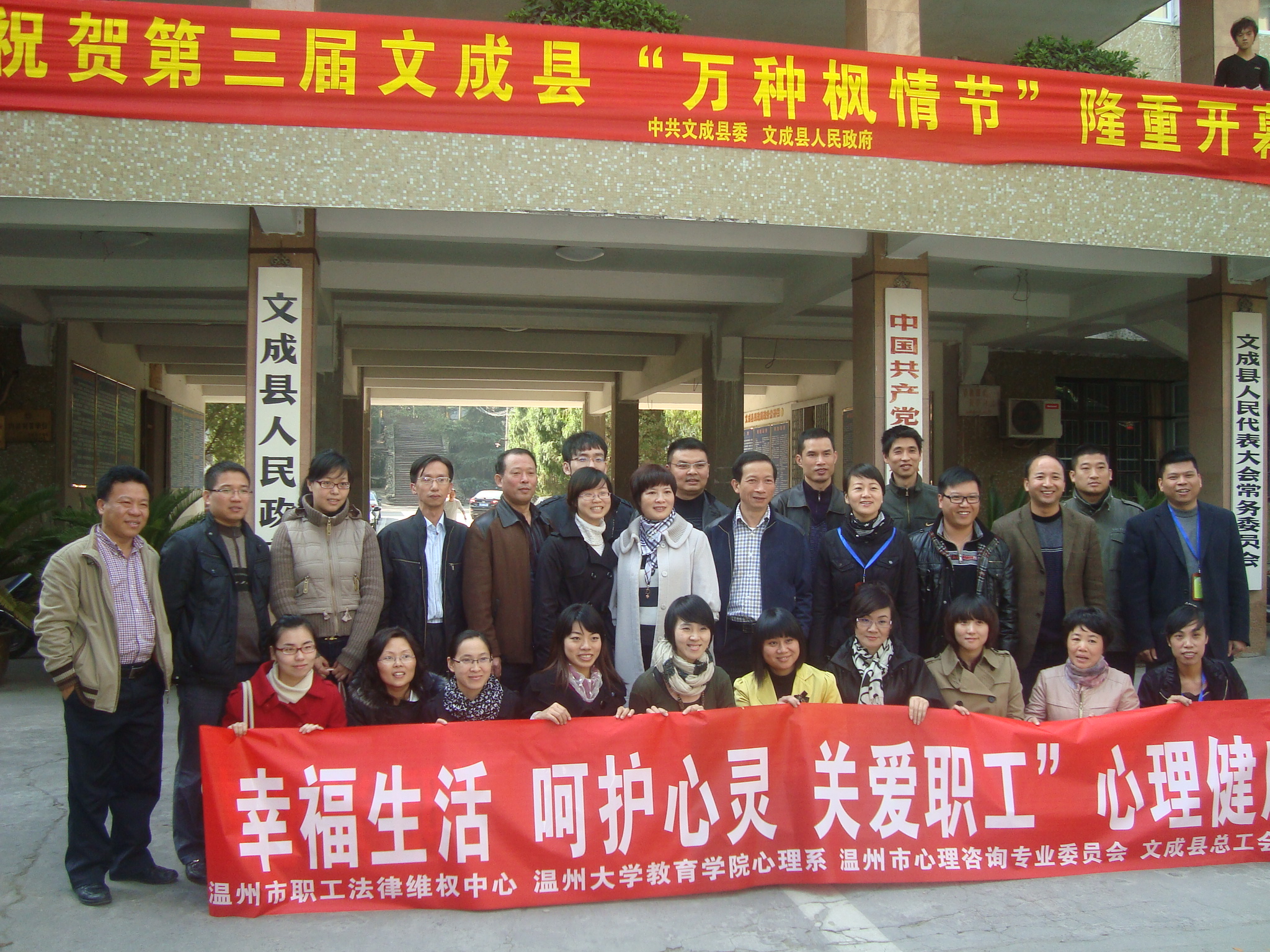 11月27日,成人色情 心理学系与温州市职工法律维权中心、温州市心理咨询专业委员会,在文成县联合开展心理健康系列活动。市总工会、文成县总工会有关领导,市心理咨询专业委员会负责人及成人色情 心理系盛建森老师参加了活动。
