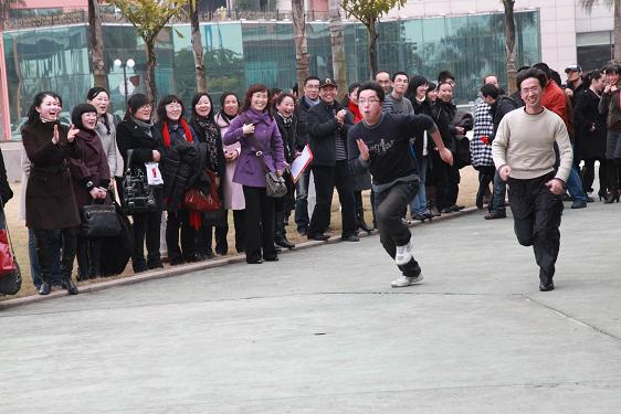 在联欢会开始前,所有到场的教职工一起来到酒店外进行“系红领巾”的游戏,每个部门各出8名教师结组参赛,活动现场既紧张激烈,又轻松搞笑,比赛高潮要算实验教学中心和小学教育系的终极PK,最终由实验中心夺得了比赛的冠军。