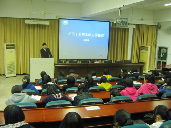 为了提高学生干部工作能力,促进和谐学院建设,3月22日晚6:30,院团委在北校3-101教室举行团学干部培训,院党总支书记蔡联群老师为现场近百名团学干部、干事,讲授了团学干部如何提高工作能力的要点。学生科长章志图老师主持讲座。