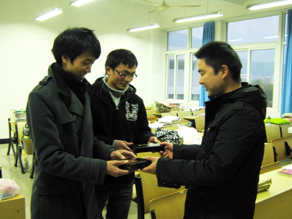 活动现场气氛温馨,一排男生还自觉在门口当起了“迎宾先生”,他们彬彬有礼的举止逗乐了大家,在笑语盈盈着,大家围坐在摆满瓜果的圆桌上自由交流。而在厨房中忙碌的同学,递菜的递菜,切菜的切菜,在食堂师傅的帮助下热火朝天的包起了汤圆与饺子。在焦急的等待中,第一锅饺子终于热气腾腾地出炉了,辅导员与学生干部们一哄而上,一抢而光。学生科长章志图老师戏言:“我们学生干部战斗力还是蛮强的!”随着一锅锅饺子的出炉,大家尽情的开吃,尽情的玩游戏,在轻松的交流中,大家暂时忘却工作的压力与学习的紧张。
