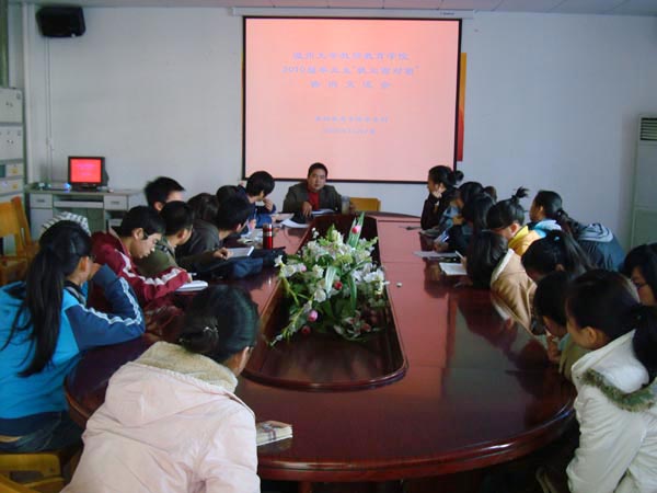 本次座谈会目的了解学生对学生科的工作态度、服务方式的看法,从而促进学生科作。座谈会上气氛轻松,大家都能积极准确地反映自己需要解决的问题和学院存在的不和谐之处。其中反映最多的是教学质量、早晚自习、寝室安全等。例如08教本的学生代表反映,早晚自习制度对于促进大家自觉学习很有帮助,但天气渐渐冷了,学院是否可以推迟早自习的时间。嵇书记认真地倾听同学们的意见和建议,在会上,她特别强调了要好好利用早晚自习,培养自主学习意识。