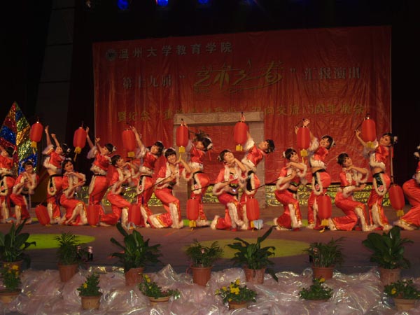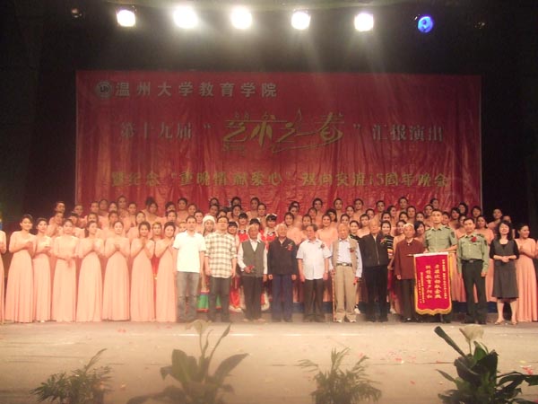 5月20日晚,成人色情 第19届“艺术之春”汇报演出暨纪念“重晚情 献爱心”双向交流15周年晚会在育英大礼堂隆重举行,会场外张灯结彩、画满全场——本届艺术节的优秀美术作品展在此展出,场内热闹非凡、座无虚席——精彩的艺术节汇报演出即将开始。成人色情 党委书记胡伟国、成人色情 团委副书记杨立淮、成人色情 党委副书记嵇小怡和温州市军分区干休所的23名老干部、老领导们出席汇报演出。