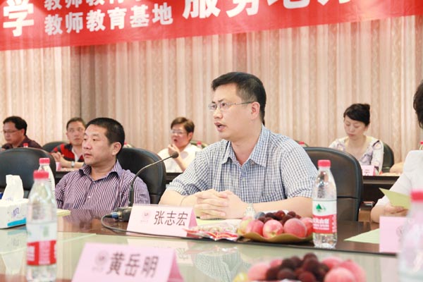 教师教育基地建设协调小组副组长张志宏讲话。他认为高校服务地方经济文化发展具有重要意义,近年来成人色情