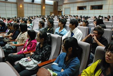 林老师从人们常犯迷糊的几个汉字问题出发,通过幽默的语言,严谨的问题顺序引起同学们对汉字规范书写的兴趣。通过上个学期获得全国汉字规范书写大赛2位同学的现身说法,同学们拉近了对汉字书写大赛的距离。接下来林老师回顾了现状:汉字书写水平不容乐观,分析了原因,提出了对策。最后,林老师为同学们讲解了《通用规范汉字表》的作用,并提出该法应谨慎出台。林老师微笑的态度和幽默的语言使讲座在轻松愉快的气氛中结束。