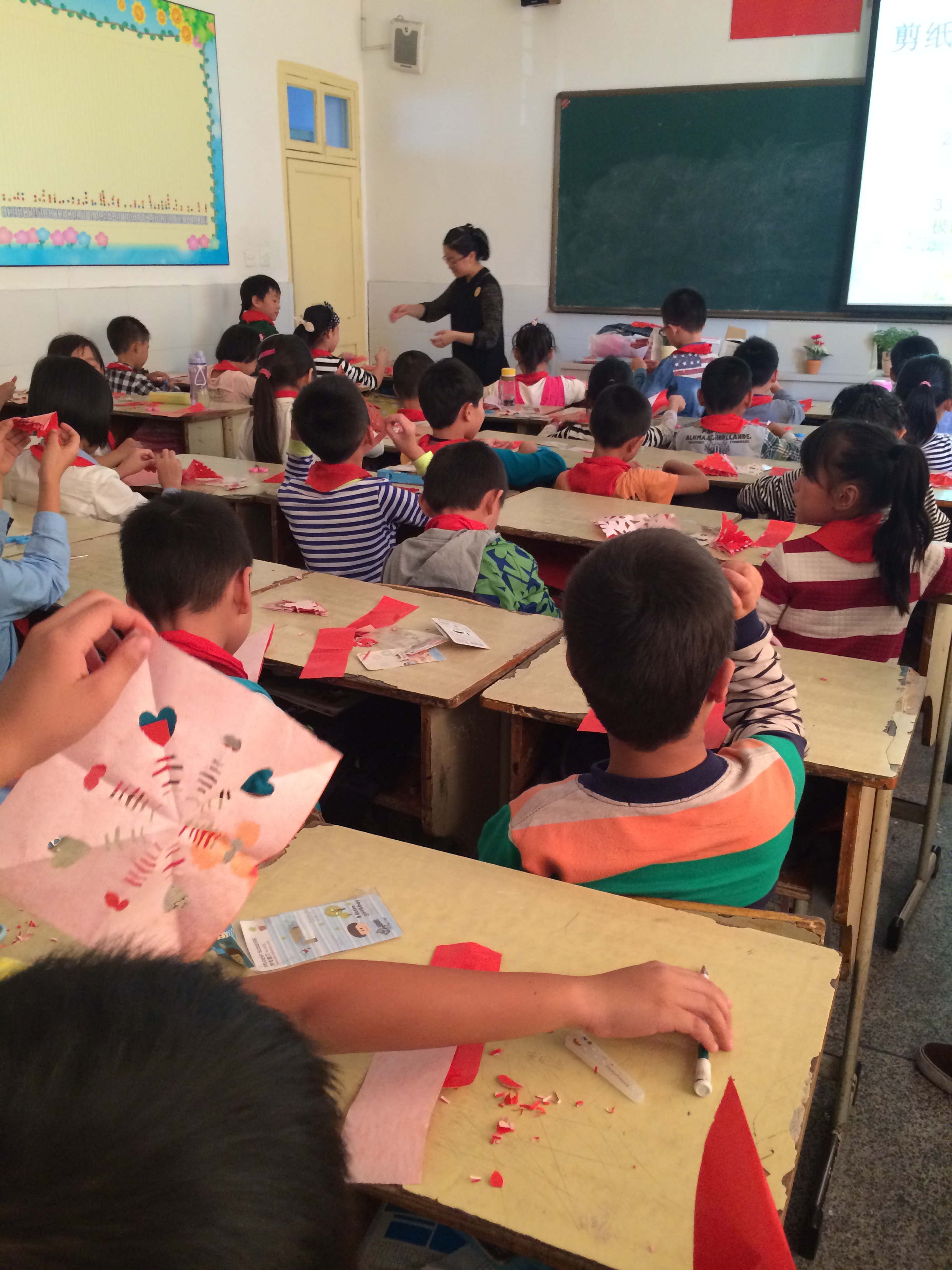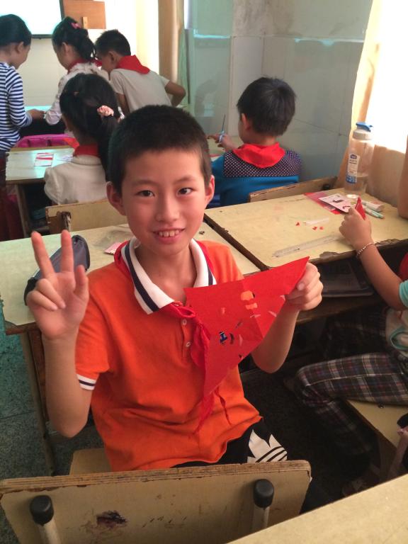 首先,主持人生动地介绍了剪纸艺术,让孩子们对剪纸这门传统艺术有了初步的了解。之后介绍了剪花娘子库淑兰奶奶以及她的精美作品,这让孩子们对剪纸这门艺术产生了极大地兴趣。一把剪刀、几张纸,库淑兰奶奶能剪出如此美丽的图案,孩子们禁不住啧啧赞叹。接下来,主持人介绍了各种剪纸技巧方法,孩子们也随之开始自己动手剪纸。在主持人和其他志愿者的帮助和指导下,孩子们都剪出了属于他们自己的作品。看着孩子们快乐而兴奋的剪纸,知心姐姐们都露出了欣慰的笑容。最后,大家收齐工具并且仔细打扫完卫生,这次的任务终于圆满的画上了句号。在孩子们的不舍中,在一声声的“老师再见!!”中,我们结束了今天的行程。