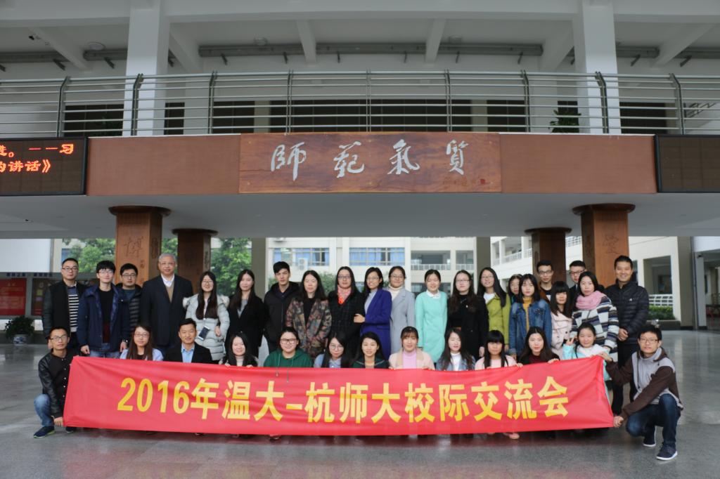 和杭州师范大学的研究生做交替汇报。汇报内容涵盖了课堂教学、招生模式、竞争、道德、课程领导力、幼儿礼貌教育、青少年公益行为、特殊儿童行为问题等方面的研究。与会期间,师生积极互动,参会人员积极提出自己的疑问与见解,老师们则从专业的角度给予点评并提出建议,整个会议气氛热烈,学术气息浓厚,彰显出了相互交流、相互学习、协同成长、共荣共进的校际交流会的宗旨。在交流会间隙杭师大师生还参观了我校校园及校史博物馆,感受温大另一面的美,加深了杭师大师生对我校的了解。会议结束后所有参会人员一起拍照合影留恋。