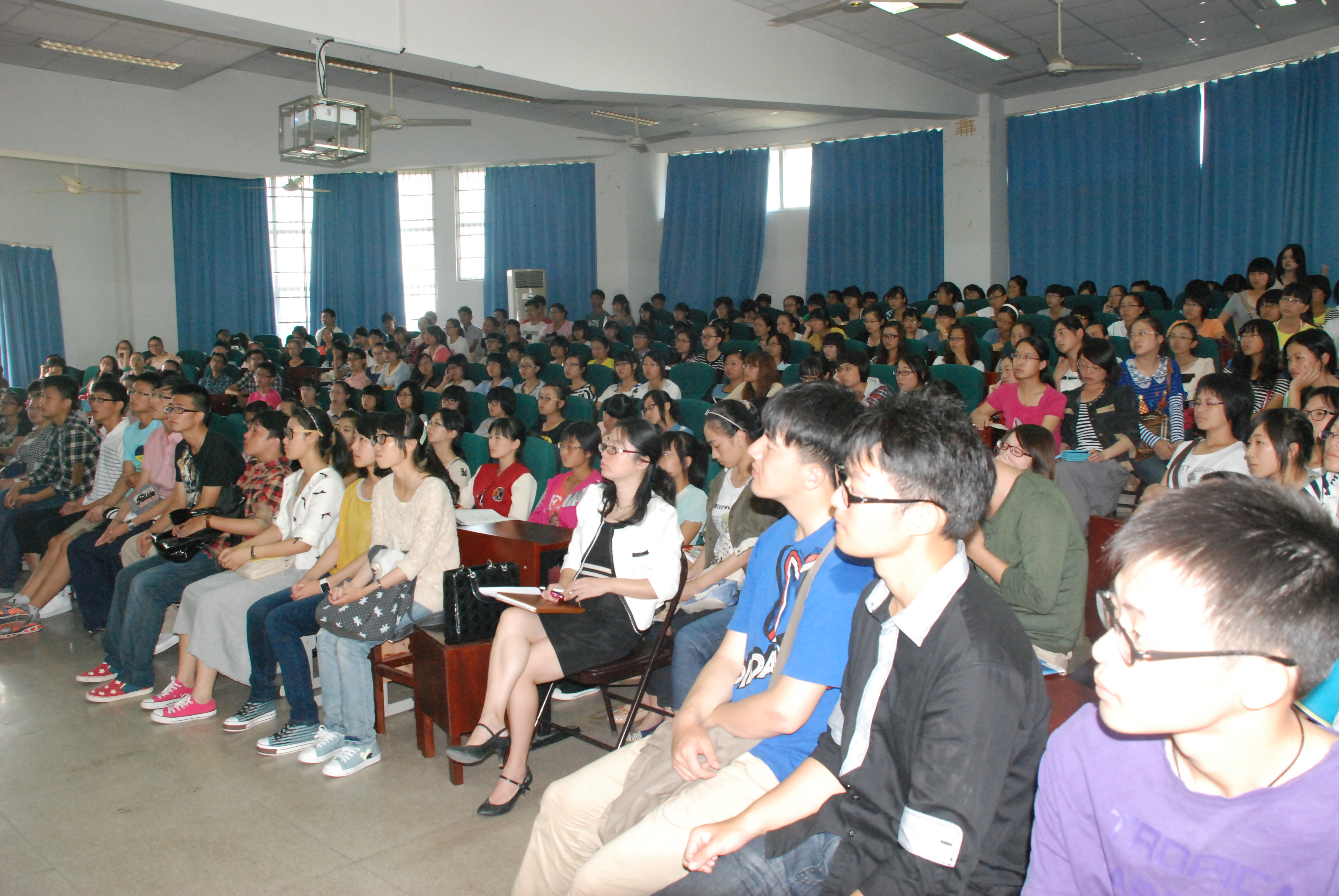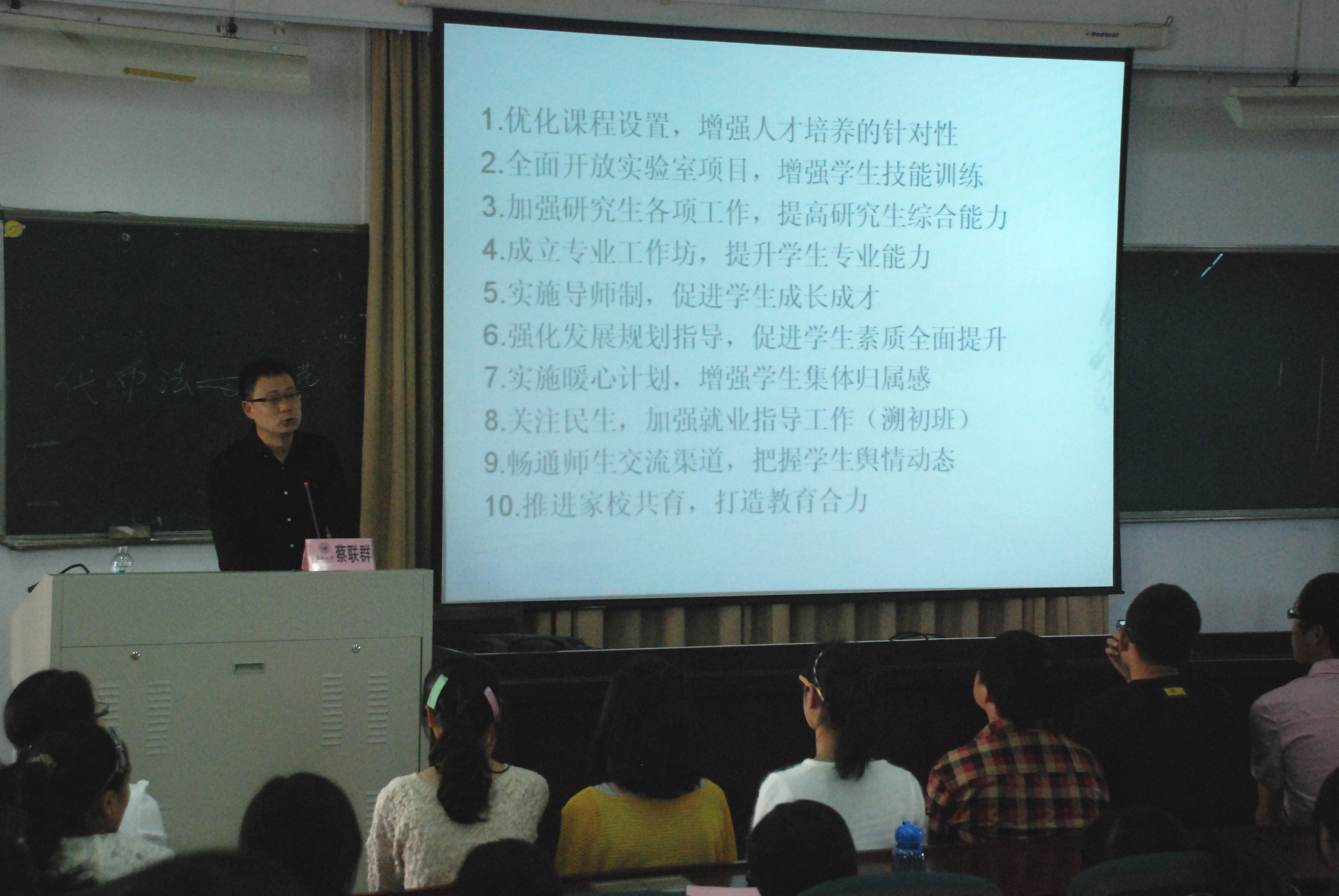 党总支书记蔡联群老师在北校区3号楼101教室为2012级新生开讲“我的大学第一课”,掀开新生大学学习生活新的一页。