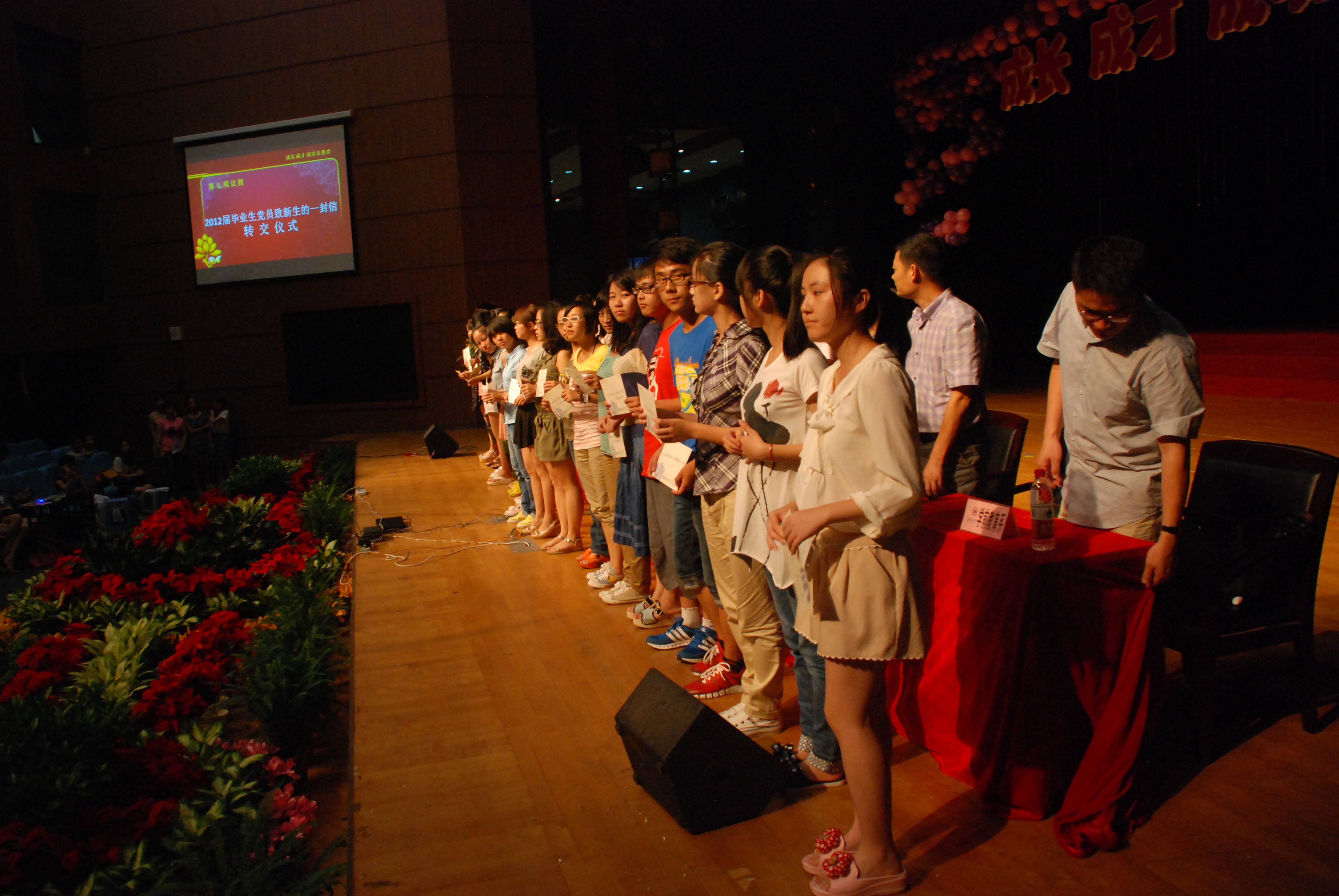 她的发言是她写给新生的信中的内容。今年,2012届毕业生党员用他们亲身的经历和经验,从学习、工作、生活、就业等各个方面引导新生们规划好大学生活,并以信件的形式写给2012级新生,100名党员100封信。2012届毕业生党员将他们的关爱传递给新生。为了方便给新生同学答疑解惑,毕业生们在信中留下了自己的联系方式。22名新生代表上台参加了信件转交仪式。仪式虽然非常简短,但是承载了学姐学长们对于新同学的祝福,传承了成人色情