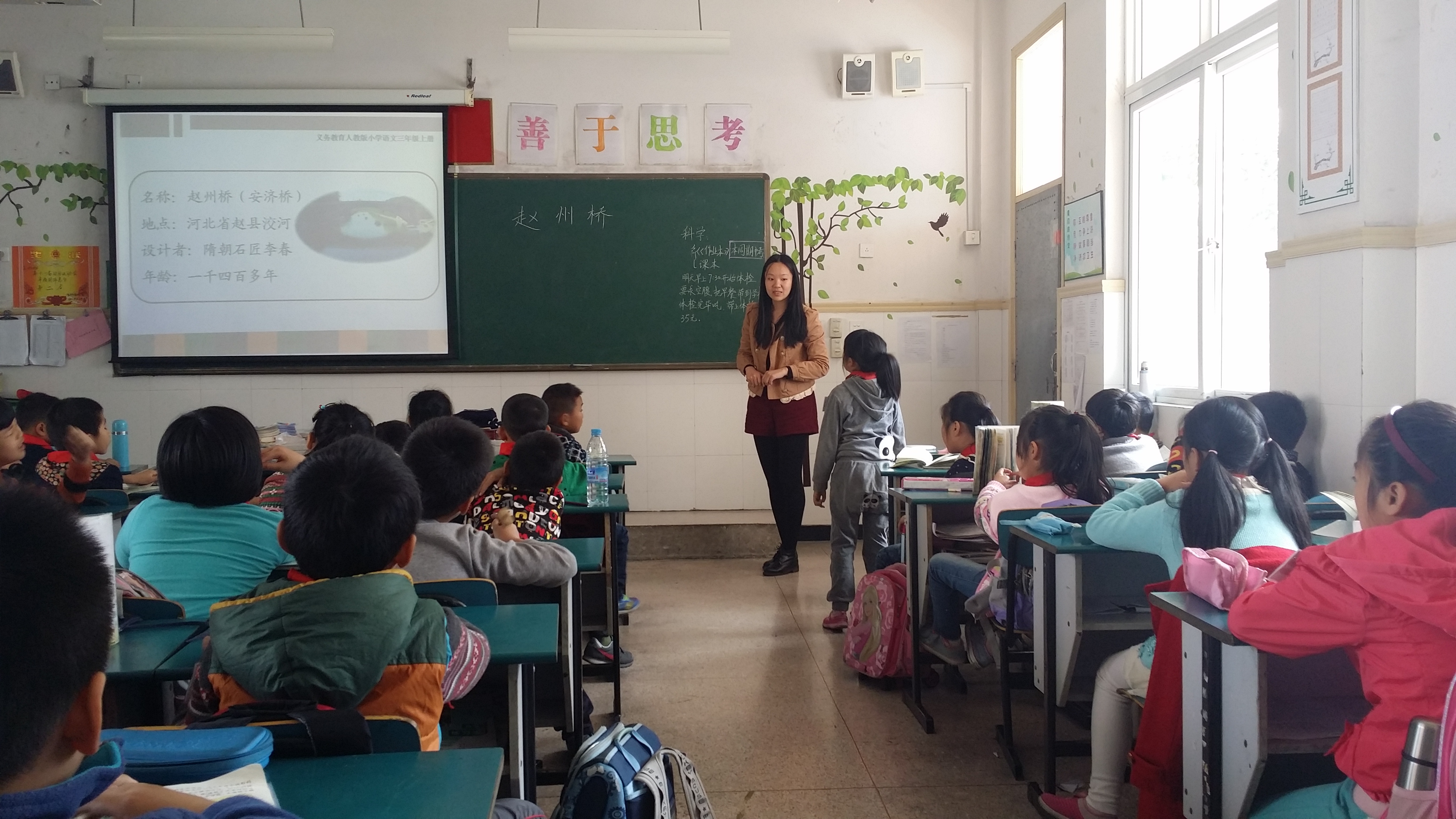 实习生的感谢,并与在座的老师就实习基地建设等问题进行了进一步的交谈。随后,彭院长携带各位老师听取了在该校实习的学生李婷同学的一节汇报课《赵州桥》。听课结束后,已经日上三竿,中午11:30,众位老师还认真地进行了评课,大家畅所欲言,肯定了李婷同学上课的成功之处,也指出了一些不足。彭院长也从语文教学法角度对李婷的这节课提出了诚恳的意见,勉励她还需在语言教学角度多多提升。