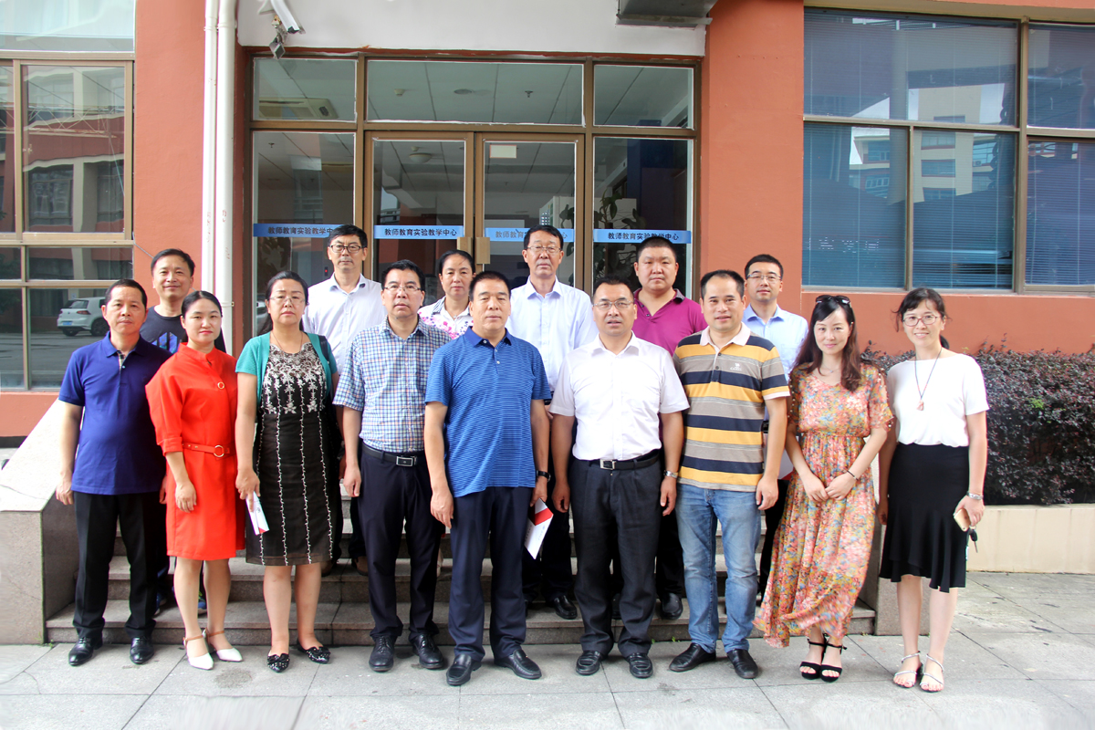 2018年7月13日上午新疆阿克苏教育局张百和书记、陈常龙副局长一行9人在温州市委教育工委专职副书记白炳兴的陪同下来成人色情 教师教育实验教学中心参观,成人色情 书记杨立淮、副院长叶新东、副书记杨丽君、继续教育科科长林鹣鹣、实验中心主任李小志和实验教学教师热情接待了来客。
