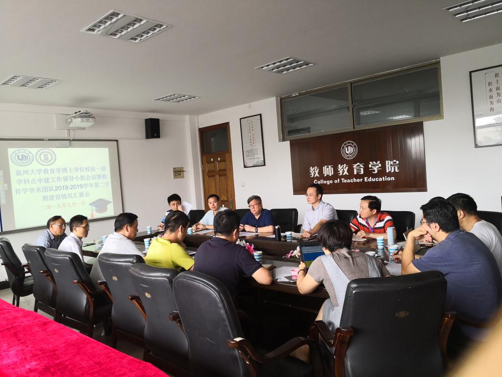 在申报教育学博士学位授权一级学科点方面近两年来开展的工作、取得的成绩和面临的问题,分析了已有的优势和存在的不足。随后各学术团队负责人汇报了2018-2019学年第二学期团队建设的情况和面临的挑战。各团队在学术交流、人才引进、成果培育和学科方向凝炼方面都取得了一定进展,并表示在未来的团队建设中继续发挥优势、补足短板、整合资源、寻求突破。