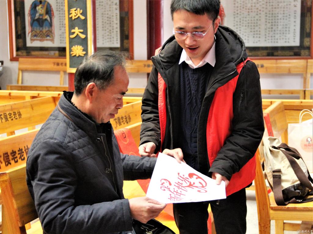 “千门万户瞳瞳日,总把新桃换旧符。”送春联是中华传统文化习俗,更是教院学子表达对老人殷切关怀的传递之举。20名青年志愿者不惧寒风凛冽,凝神挥毫,精神饱满,现场书写满载祝福与美好憧憬的春联,送予蒲岐镇的老人家们。“共迎新岁喜迎门”、“四季平安黄犬誉,九洲锦绣玉龙飞凝”、“时来运转喜开颜,多年枯木逢春花”......一幅幅构思巧妙的春联,一句句寓意吉祥的诗句都为文化礼堂增添了不少新春的喜气。活动中,一位慈祥的老人也毫不吝啬的展示了他的书法功力,以一个苍劲有力的“福”字,表达了对温大教院美好的期许。