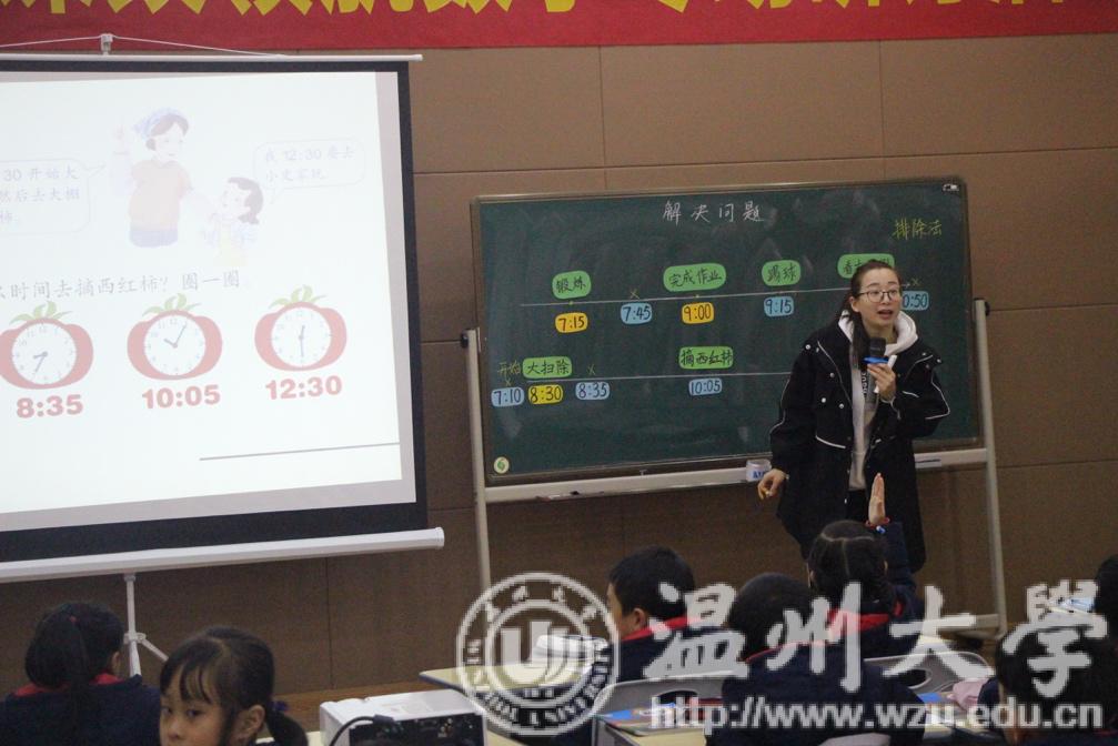 第一节课由成人色情 城附属学校胡依贴老师和二(5)班的孩子一起呈现关于时间的《解决问题》,胡老师通过时间谜语导入激发学生的兴趣,再逐一的信息呈现来落实解决问题的信息梳理、关键信息捕捉以及问题的解决,从而引导学生初步形成解题策略,在时间轴中让学生感受到时间的有序性。