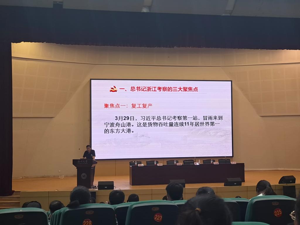 何书记从总书记浙江考察的三大聚焦点、总书记浙江考察的重要论述、总书记浙江考察的四个关键词、总书记对浙江提出的新定位这四个方面为大家解读习近平总书记浙江考察重要讲话精神。通过丰富的图片示例描述复工复产、社会治理、生态文明三大聚焦点;通过疫情防控的各项数据、各个措施解读往严处防、危中寻机、往远处谋、务实应考四个关键词。而浙江作为中国革命红船起航地、改革开放先行地、习近平新时代中国特色社会主义思想重要萌发地,省域治理水平长期走在全国前列,何书记列举了“枫桥经验”、中国首个村务监督委员会、杭州互联网法院等例子充分说明了总书记对我省省域治理方面的积极探索给予肯定。