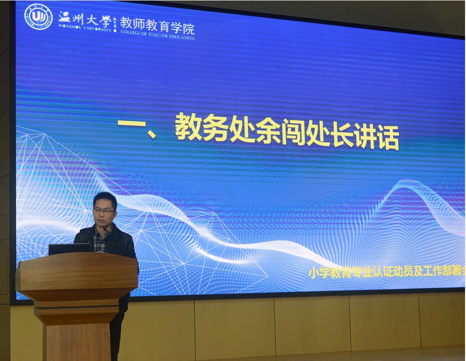 首先,教务处余闯处长莅临指导小学教育专业认证工作,他指出小学教育是我校第一个参加师范专业认证的专业,学校各部门包括教务处都会继续全力支持,学校将召开专门协调会议落实专家现场考察工作。同时,他代表学校对小学教育专业认证工作提出了希望和要求,他提出在目前的冲刺阶段,学院要明确分工,有条不紊的推进各项工作,全体教师需以饱满的热情投入到认证工作来,并预祝认证顺利通过。
