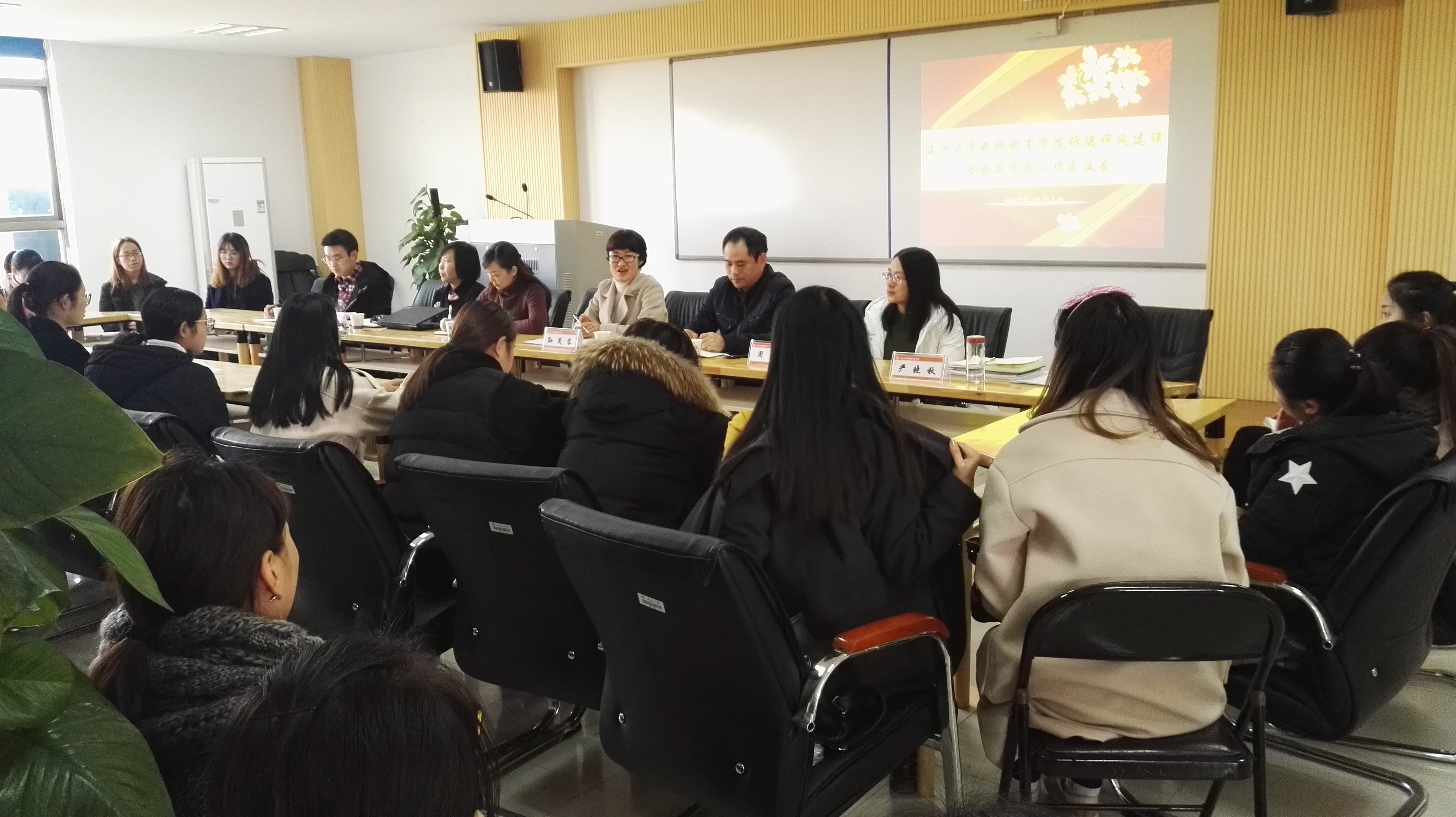于12月6日下午在9C―401召开师德师风建设暨教风学风工作交流会,学院院长孙芙蓉、党总支书记杨立淮、教育系书记周奇、教学科科长章园园、学生科副科长严晓秋、学生科潘士杰,以及学院各班班长近50人参加。会议由学院党总支副书记杨丽君主持。
