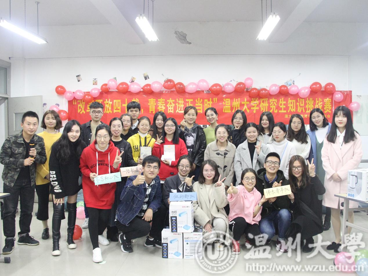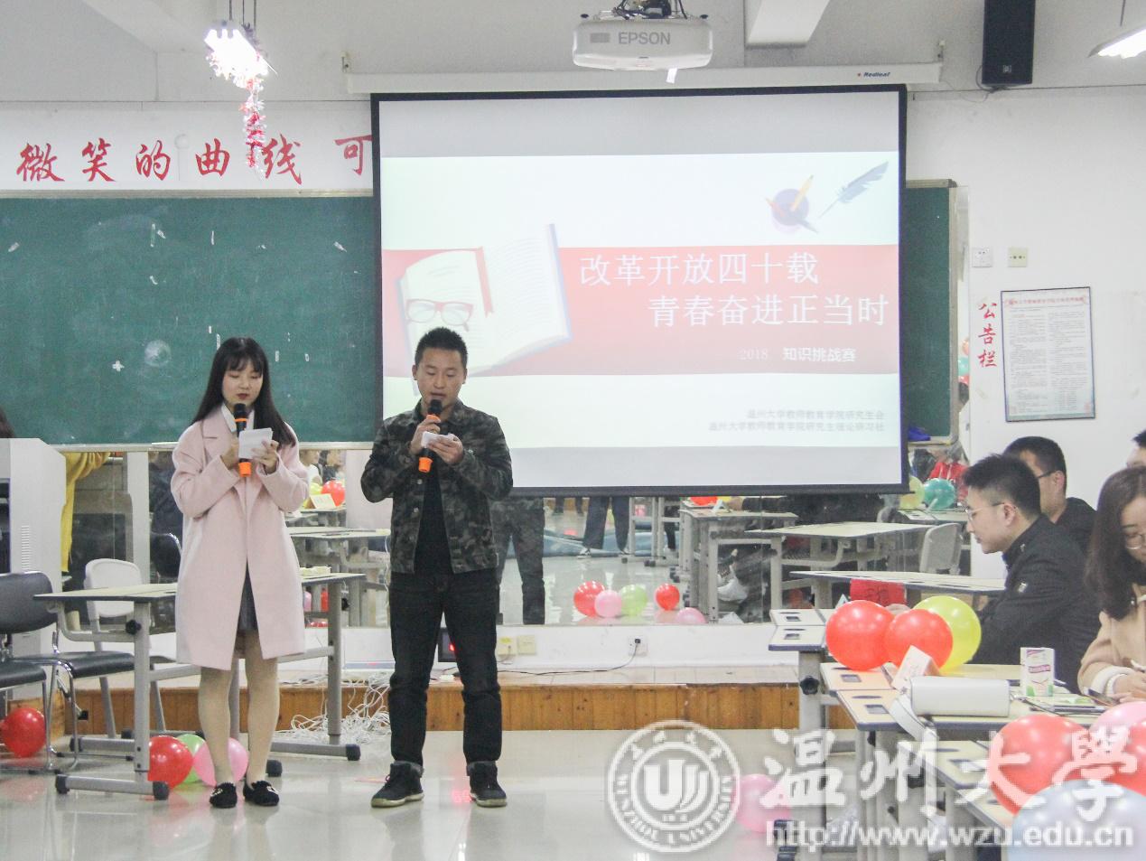 壮阔东方史,奋进新时代,为纪念改革开放40周年,引导同学们学习改革开放进程和建校历史,发扬温大学子求学问是的精神、鼓舞敢为人先的斗志,11月23日晚6:00,由教师成人色情 研究生会主办的“改革开放四十载,青春奋进正当时”纪念改革开放四十周年知识挑战赛在南校区9B308拉开帷幕。伴随着选手的热情和欢快的音乐,主持人陈雨婷、田道文宣布比赛正式开始。
